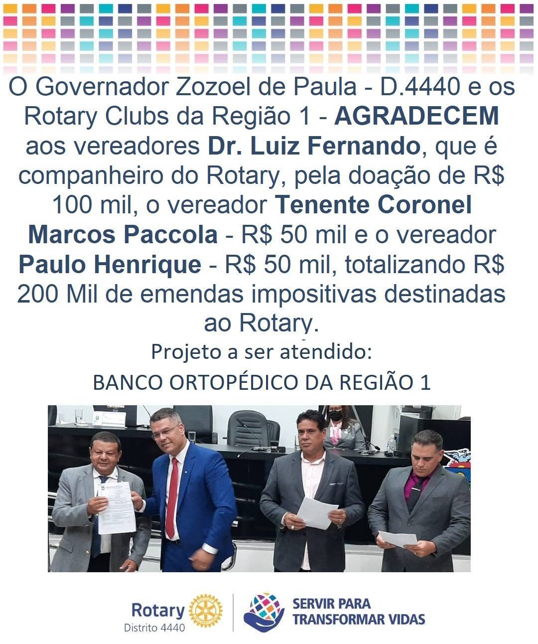 Região 1 do Distrito 4440 receberá R$ 200.000,00 de emendas para Projeto Banco ortopédico